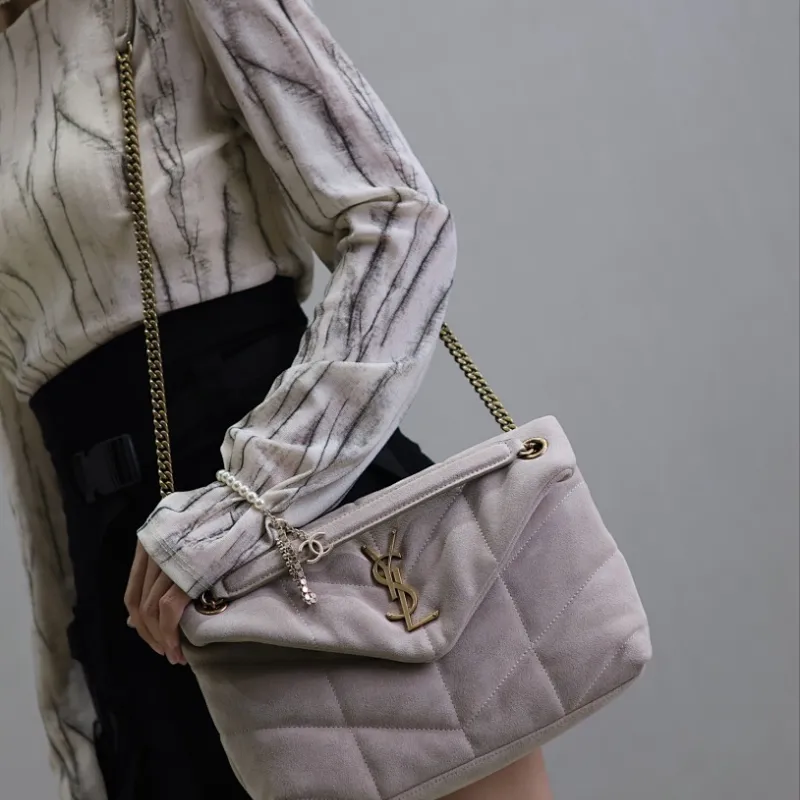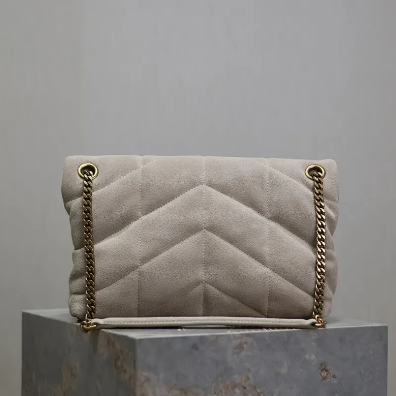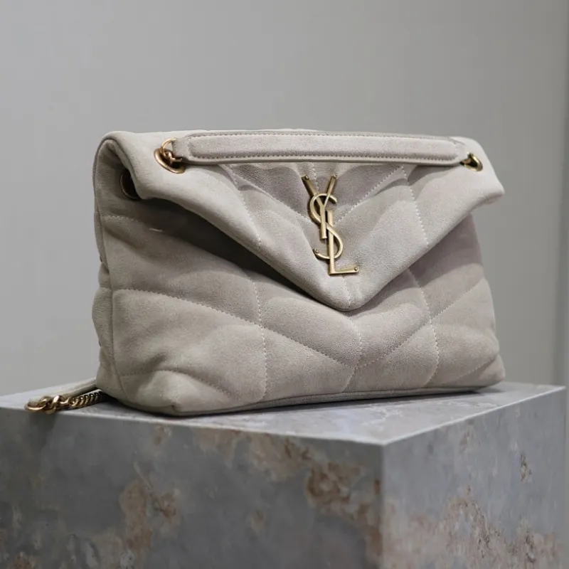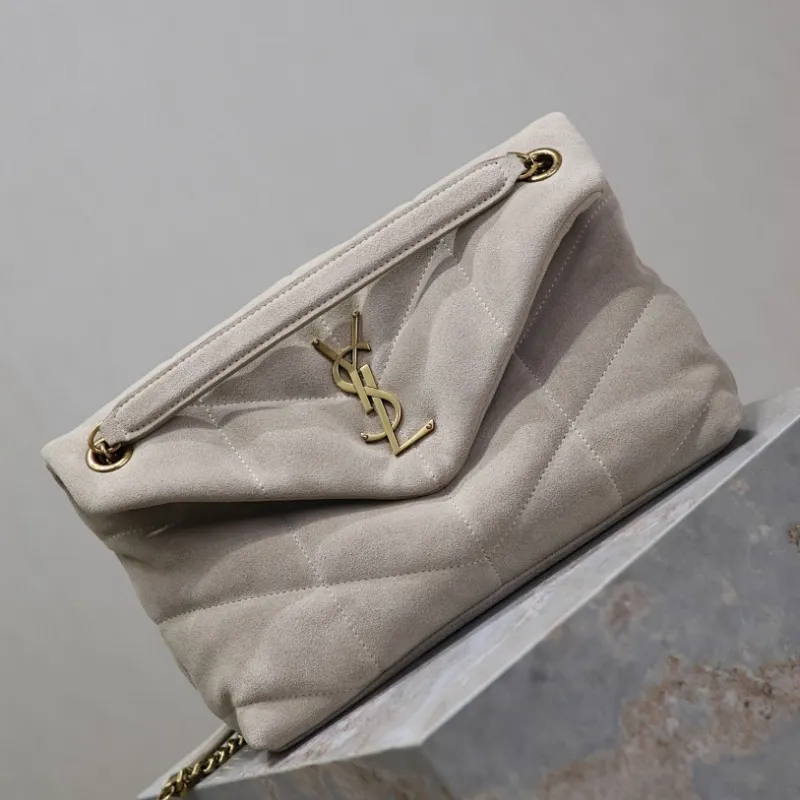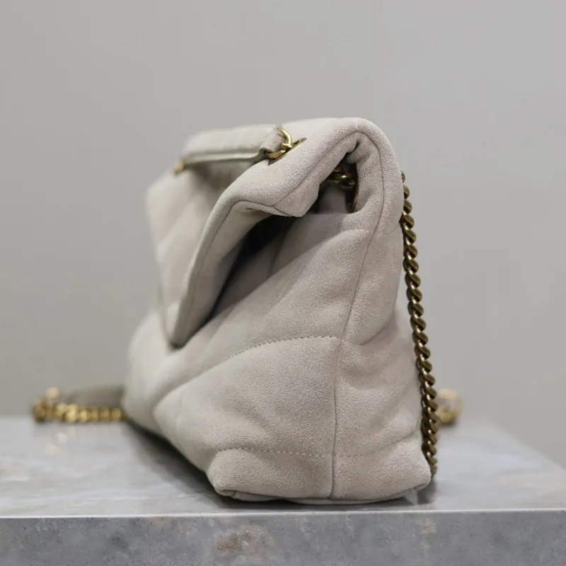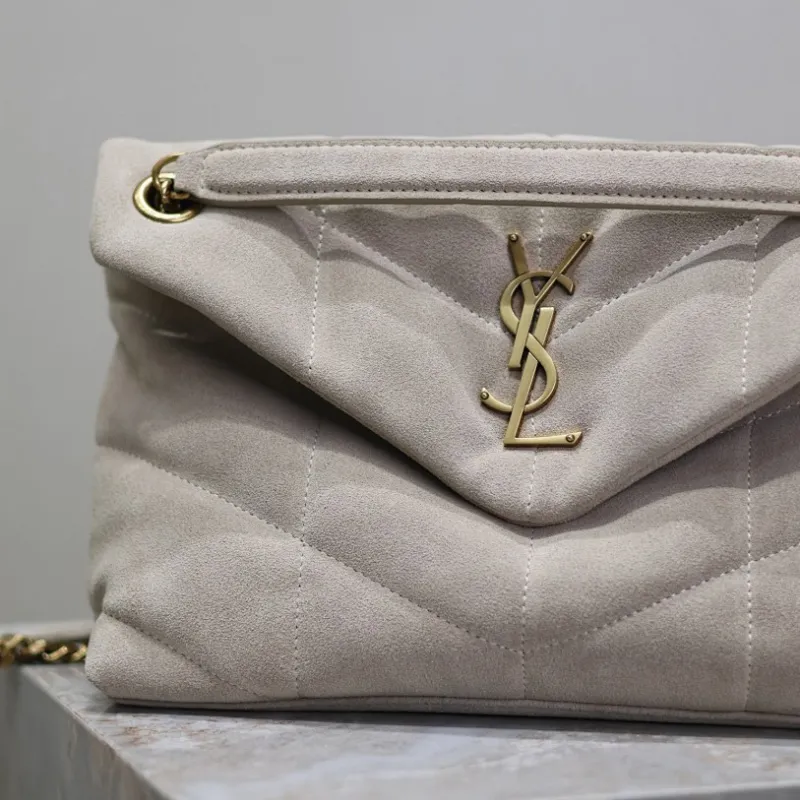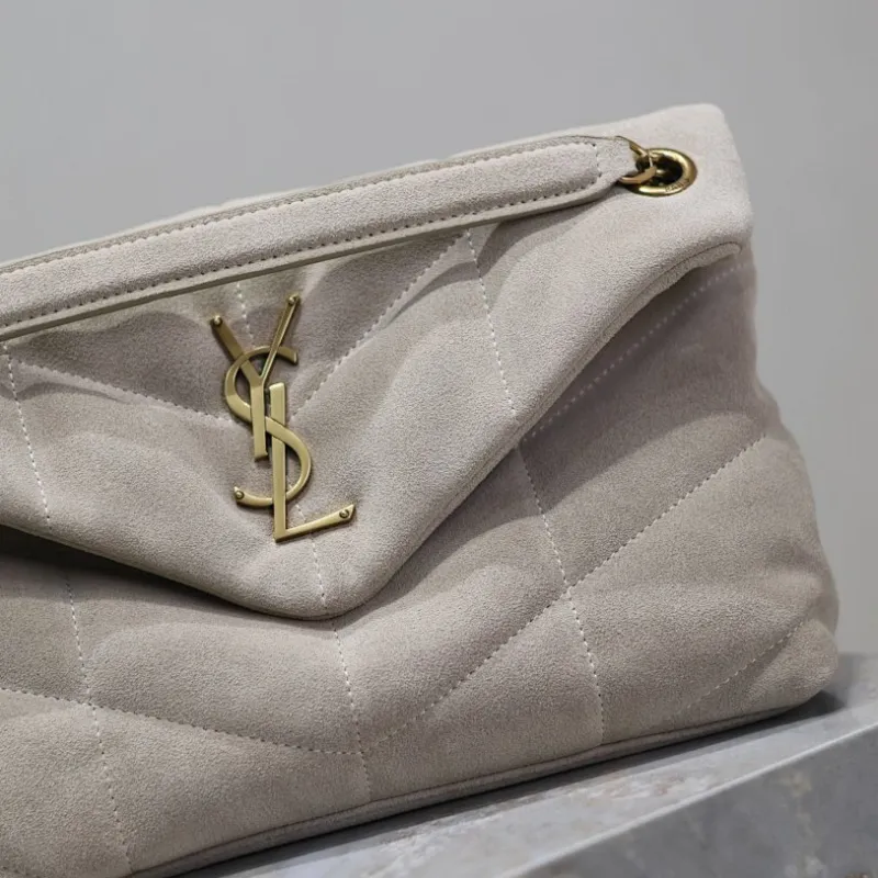 SAINT LAURENT Loulou Medium Shoulder Bag – Light Beige Suede with Chevron Quilt & Gold YSL Logo (Convertible Chain Strap) #A58772