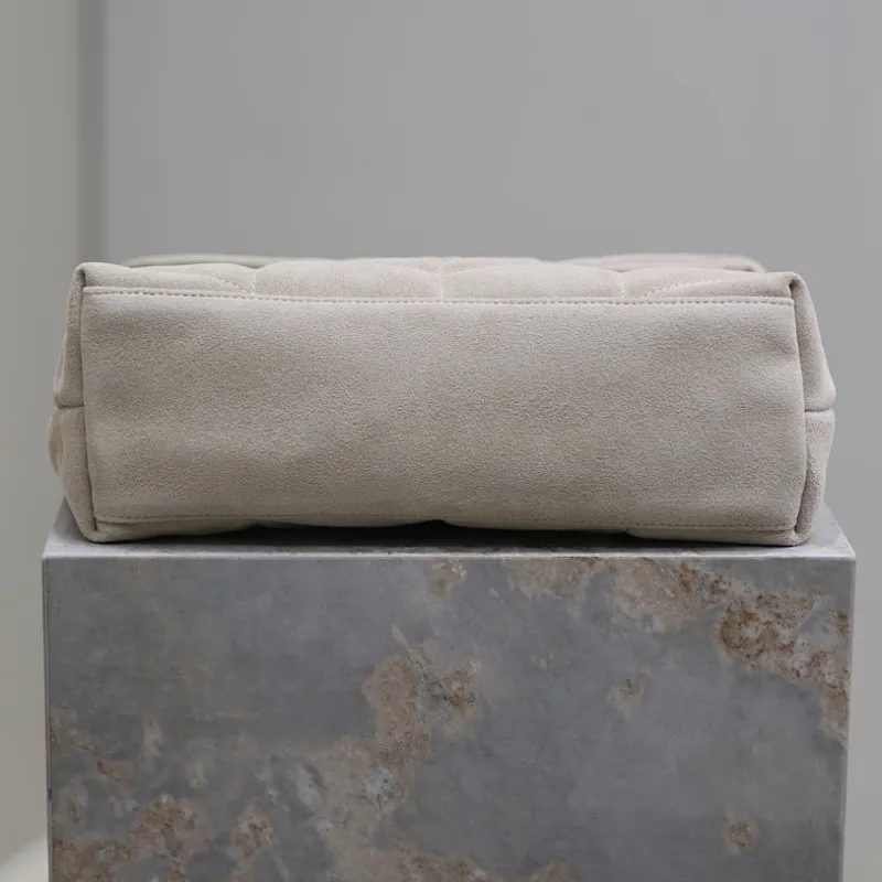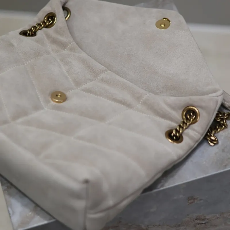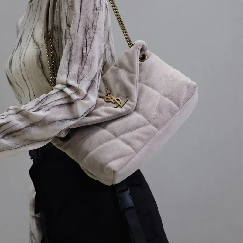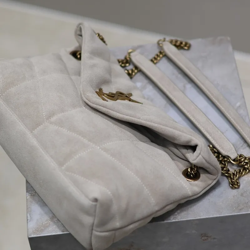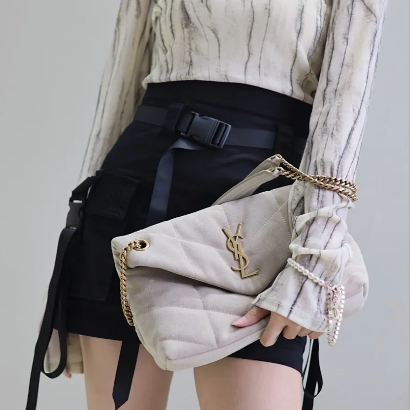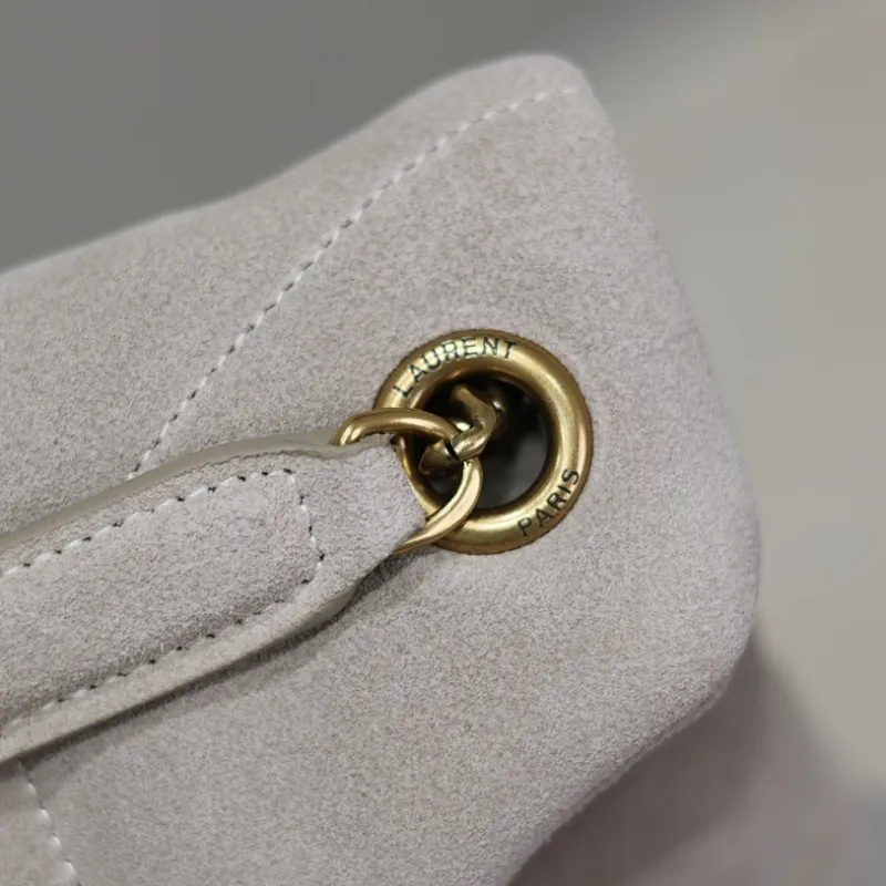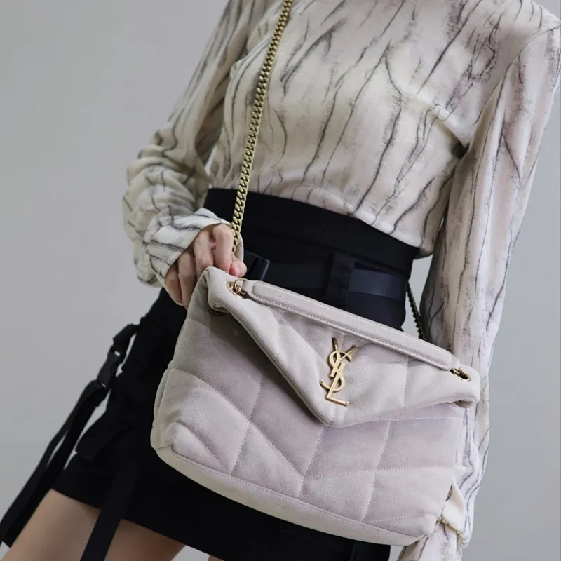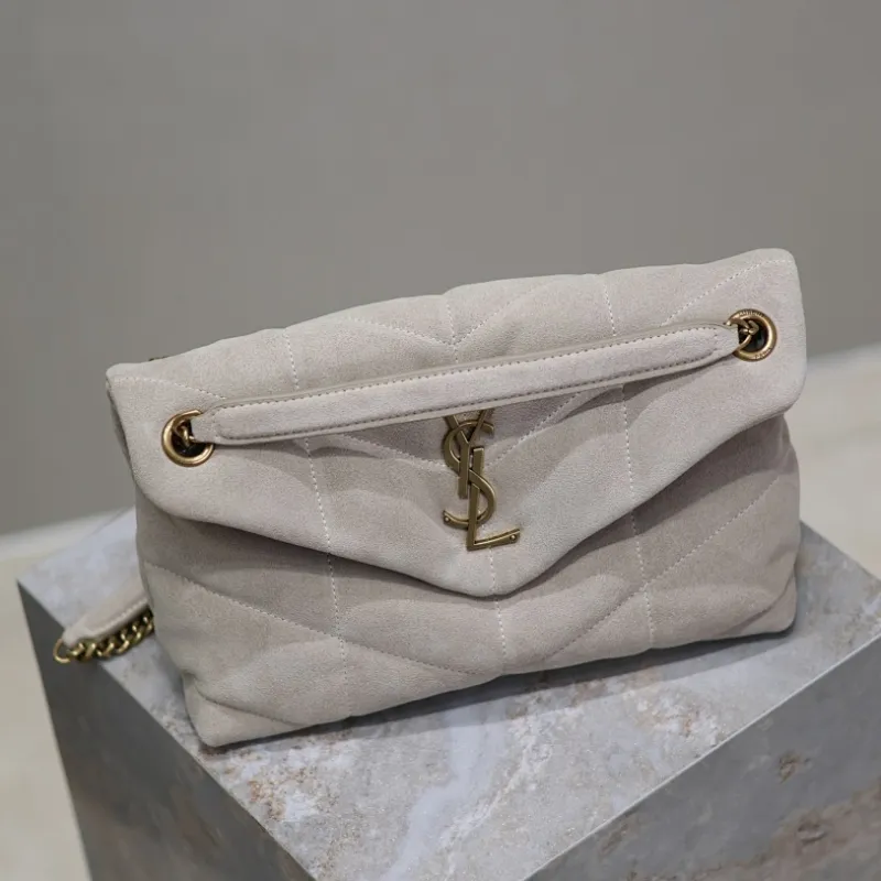 SAINT LAURENT Loulou Medium Shoulder Bag – Light Beige Suede with Chevron Quilt & Gold YSL Logo (Convertible Chain Strap) #A58772