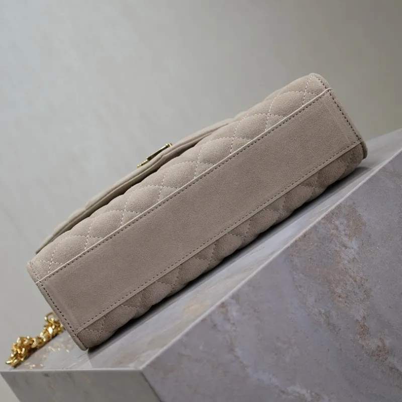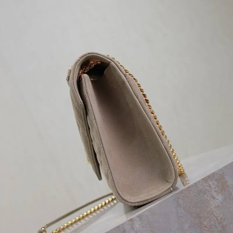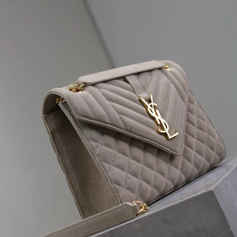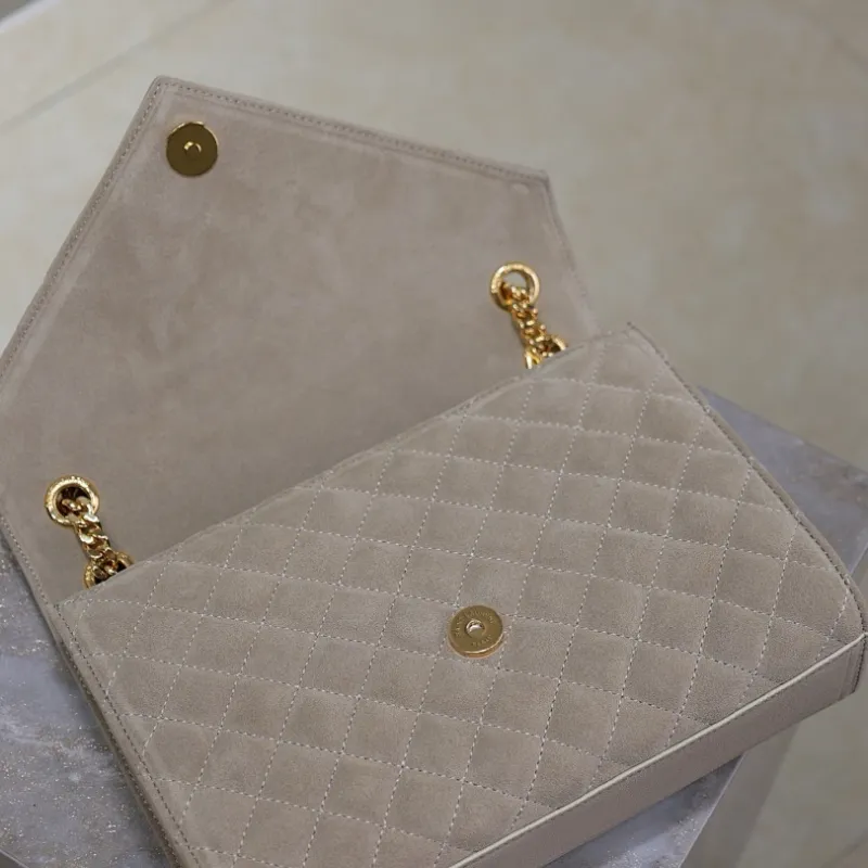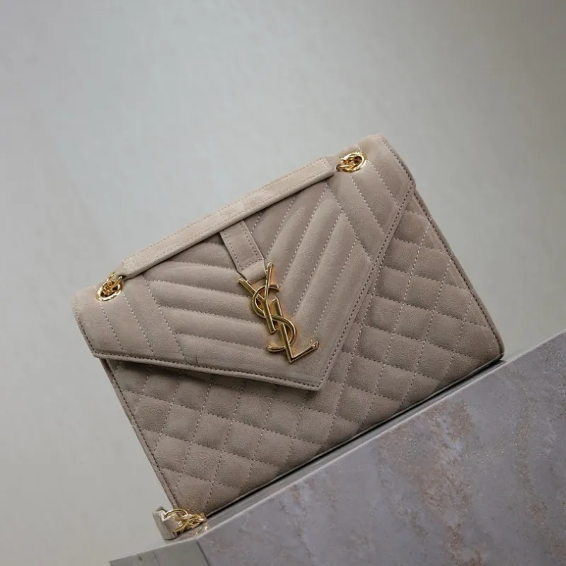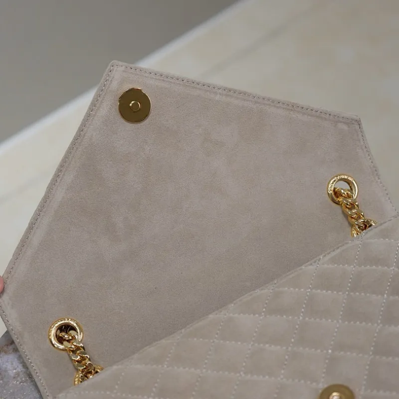 SAINT LAURENT Loulou Small Envelope Crossbody Bag – Dusty Beige Suede with Mixed-Quilt Stitching & Gold YSL Logo (Detachable Chain Strap) #A58777