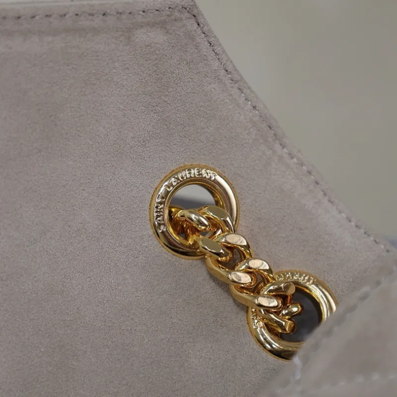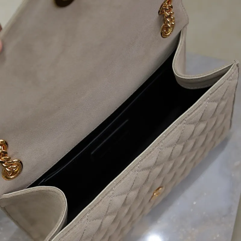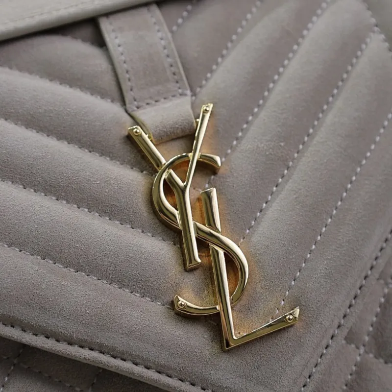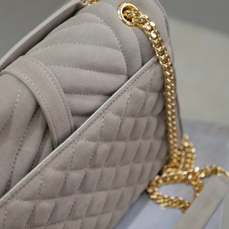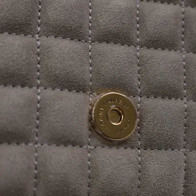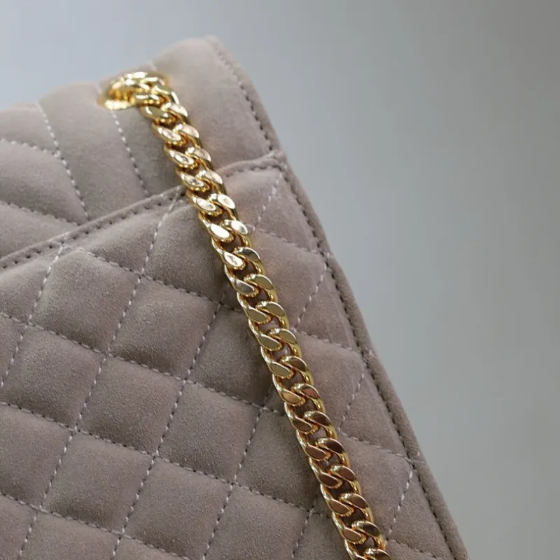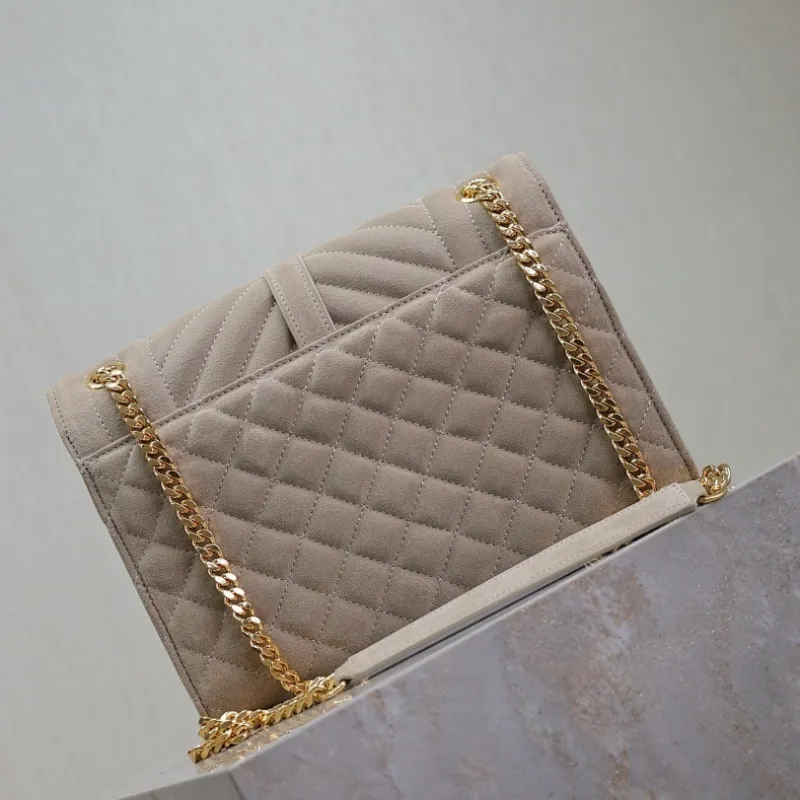 SAINT LAURENT Loulou Small Envelope Crossbody Bag – Dusty Beige Suede with Mixed-Quilt Stitching & Gold YSL Logo (Detachable Chain Strap) #A58777