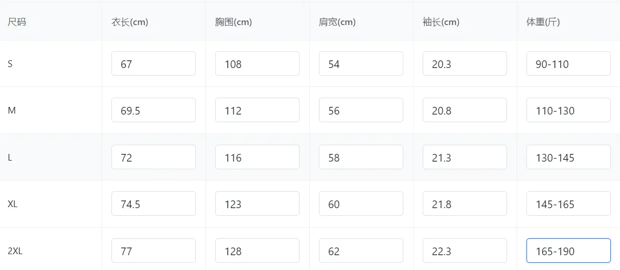 Size S M L XL 2XL